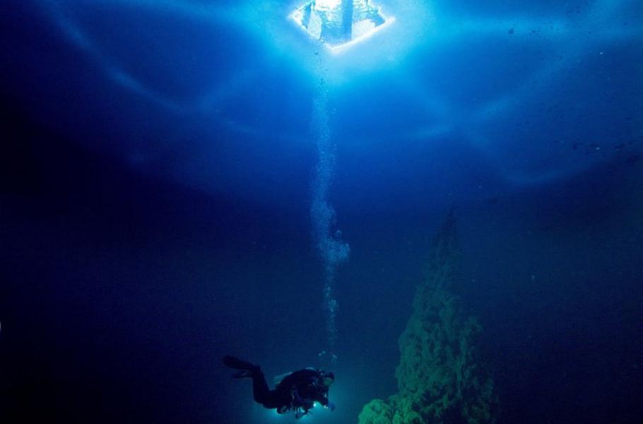 Objevování pod hladinou nemívá žádné meze, jak dokazuje i zatopený lom u ruského Jekatěrinburgu. Lidé tam nacházejí potopené borovice a keře, které zůstávají zelené mnoho desítek let, a vytvářejí tak zvláštní podmořskou krajinu. Až do hloubky 60 m a zpět se potápěči dostávají skrz díru v ledu, přičemž kruhy a paprsky v jejím okolí vytvářejí uměle, aby se pod vodou snáz orientovali. Snímek pořídil Viktor Ljaguškin zhruba 30 m pod hladinou, kde má voda 4 °C. (foto: Shutterstock)