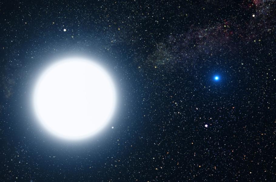 Umělecké ztvárnění dvojhvězdy Sirius A a B. Jasnost této nejzářivější hvězdy noční oblohy se bude příštích 60 tisíc let ještě zvyšovat.