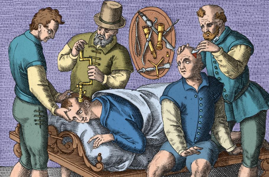 Při trepanaci se pacientovi vyvrtá díra do lebky, a obnaží se tak šedá kůra mozková. Jaký z toho plyne užitek? Ve skutečnosti žádný, dávní „lékaři“ však věřili, že za bolesti hlavy a duševní choroby mohou démoni, kteří dotyčného ovládli. A vytvořením otvoru v lebce vznikla cesta, kudy mohli nezvaní hosté odletět, načež se nemocnému ulevilo. Řada nešťastníků však při zákroku zemřela, čímž se prý zlí duchové za vyhánění mstili… (foto: Profimedia)
