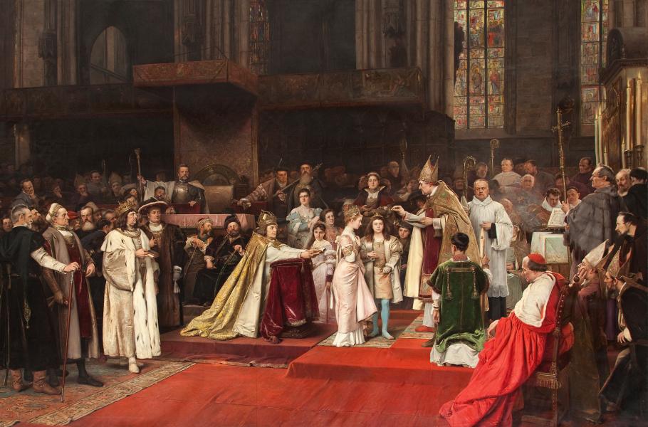 Spojení středoevropských rodů Jagellonců a Habsburků. Sňatek Ludvíka a Marie ve Vídni roku 1515. (ilustrace: Wikimedia Commons, Václav Brožík, CC0)