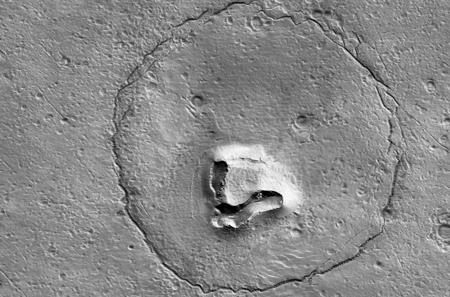 Sonda MRO pořídila snímek z výšky 250 kilometrů nad povrchem Marsu s využitím kamery s vysokým rozlišením HiRISE, která patří k nejvýkonnějším, jaké kdy byly poslány k jiné planetě. NASA uvedla, že jakkoli se snímek nepochybně podobá medvědímu obličeji, ve skutečnosti ho nejspíš tvoří seskupení různých zlomů, nánosů usazených na okraji zasypaného impaktního kráteru a lávových proudů.