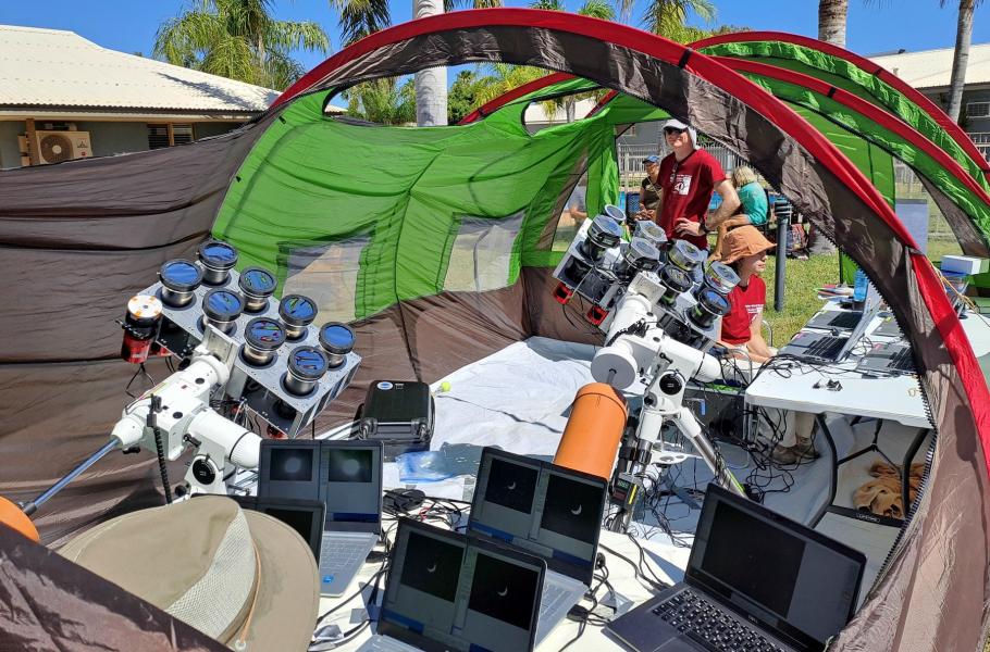 Expedice začala zhruba dva týdny před zatměním kompletním přebudováním aparatury, kvůli kterému letěla brněnská část týmu nejprve na Havaj a odtud pak s americkými kolegy dále do Austrálie. „Z Havaje jsme odlétali se zhruba půl tunou vybavení, které se muselo nejprve proclít. A dalších 250 kilogramů dříve odeslané techniky nás už čekalo v australském Learmontu,“ vyjmenovává matematička Jana Hoderová, která se expedice osobně zúčastnila spolu s kolegou Pavlem Štarhou a studentem mechatroniky Matějem Štarhou.