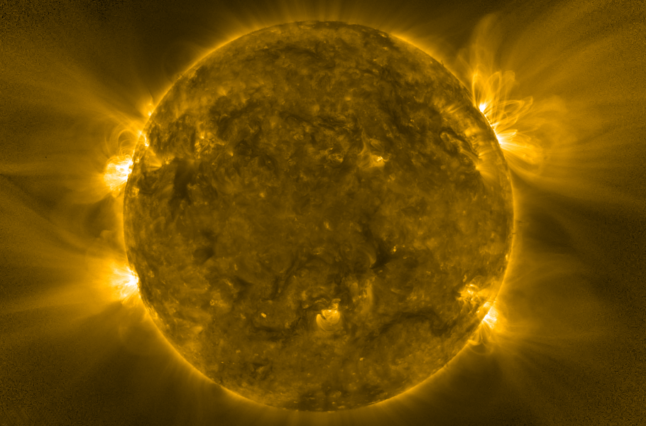 Snímek pořízený zařízením Extreme Ultraviolet Imager z letošního března ukazuje Slunce na vlnové délce 17 nanometrů. Jedná se o vlnovou délku, kterou vydává plyn o teplotě kolem jednoho milionu stupňů.