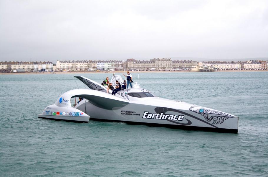 Trimarán – neboli loď s třemi trupy – s názvem Earthrace zkonstruovala společnost Calibre Boats původně s cílem překonat rekord v obeplutí světa. Plavidlo poháněl motor na biodiesel a využívalo i řadu dalších ekologických materiálů. Na první cestu oceánem vyrazil Earthrace v roce 2007, nicméně u Guatemaly se srazil s rybářskou lodí a jeho plavba se musela přerušit. Také pokus v roce 2008 provázelo mnoho komplikací, posádka jej však po 60 dnech úspěšně dokončila. Poté se plavidlo přejmenovalo na Ady Gil a ochranáři ho nasadili do boje proti japonským velrybářům: Po nehodě ovšem trimarán skončil na dně moře.