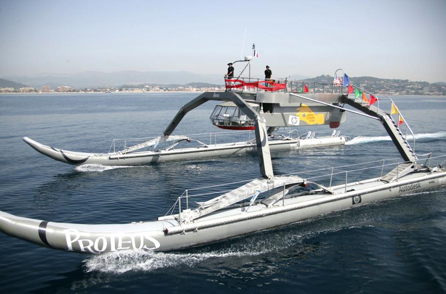 Katamarán Proteus je sice zatím ve stavu prototypu, přesto se může pochlubit neotřelým přístupem k mořeplavbě: Jedná se o tzv. adaptabilní plavidlo, které vlny nerozráží, ale díky svým pomyslným končetinám se jim přizpůsobuje. Nejezdí tedy „ve“ vodě jako klasické lodě, nýbrž spíš „na“ ní. Prototyp měří na délku 30 metrů a uveze až 12 tun nákladu. Pohánějí ho dva dieselové motory, zajišťující dojezd 8 000 km, přičemž maximální rychlost dosahuje 55 km/h (30 uzlů). Na palubě se nachází zázemí pro dvoučlennou posádku, která je k řízení lodi zapotřebí.