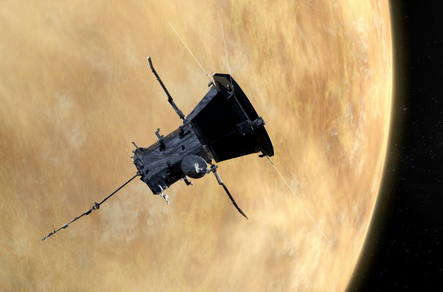 Vizualizace průletu sondy Parker Solar Probe kolem Venuše. (ilustrace: NASA/Johns Hopkins APL/Steve Gribben, CC BY-SA 4.0)