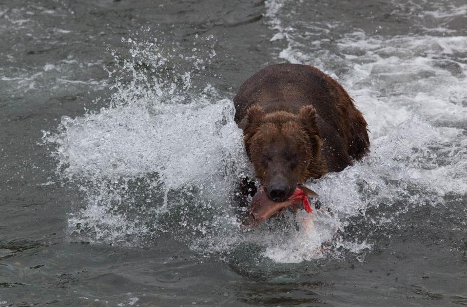 Fascinující a vyhledávanou podívanou je ale zejména pozorování medvědích „rybářů“. Nejvyšší sezona výskytu medvědů grizzly u světoznámých vodopádů Brooks Falls je v červenci, kdy sem přicházejí na tah lososů. Samotný tah začíná koncem června a trvá přibližně do poloviny září.