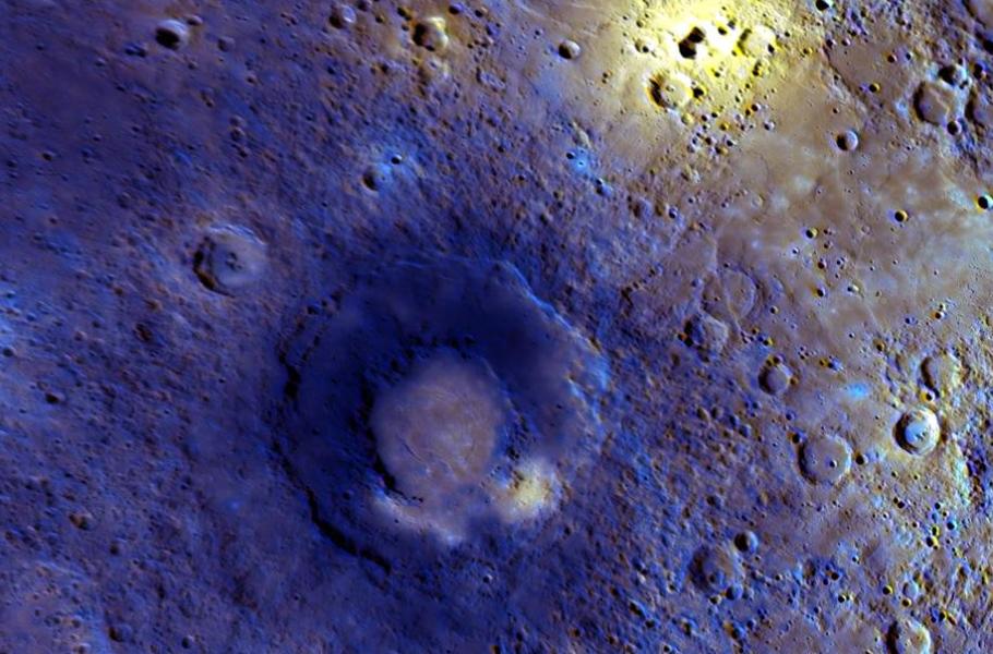 Na obrázku vidíme uprostřed dvojitý kráter (o průměru 290 km), jehož vnitřní část je hladká – může jít o důsledek výlevu lávy. Světle žlutá oblast vpravo nahoře je deprese bez okolních valů, která rovněž představuje kandidáta na silnou vulkanickou aktivitu. Barevné podání snímku vzniklo počítačovou úpravou.