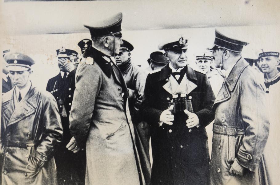 Vedení třetí říše a Kriegsmarine. Zprava Adolf Hitler, Erich Raeder, Werner von Blomberg a Joseph Goebbles.