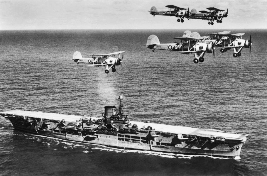 Bombardéry Fairey Swordfish nad bitevní lodí Ark Royal, které německou bitevní loď zmrzačily. (foto: Profimedia)