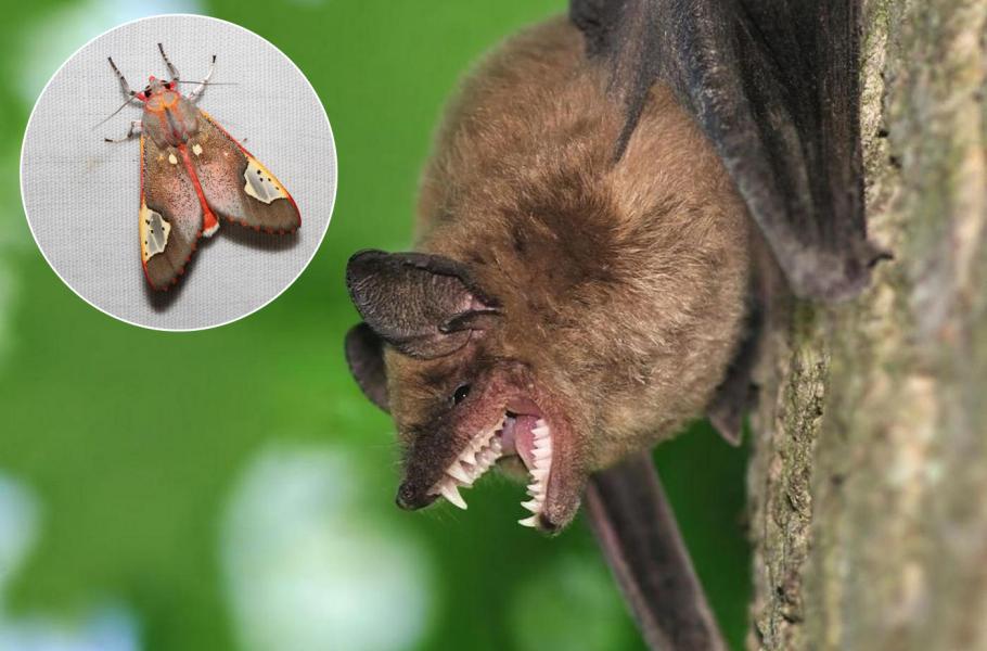 Netopýr hnědý (Eptesicus fuscus), jenž s oblibou loví můry Bertholdia trigona (ve výřezu). Můra útočící netopýry mate sérií ultrazvuků.