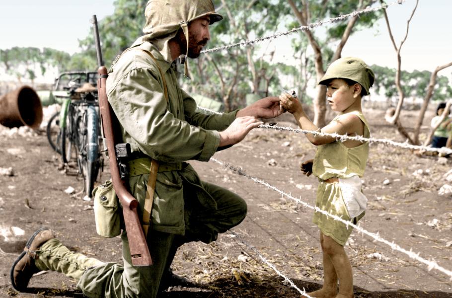Štábní seržant (přibližně ekvivalent rotného) americké námořní pěchoty Federico Claveria podává skrz plot z ostnatého drátu čokoládu japonskému chlapci drženému v internačním táboře na ostrově Tinian, v Mariánských ostrovech. Snímek symbolizující lidskost uprostřed zuřícího konfliktu pořídil v srpnu 1944 desátník George Mattson, který sloužil stejně jako Claveria coby oficiální bojový fotograf námořní pěchoty.