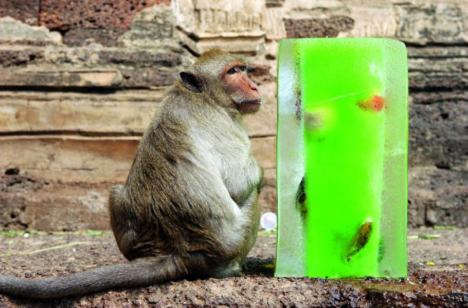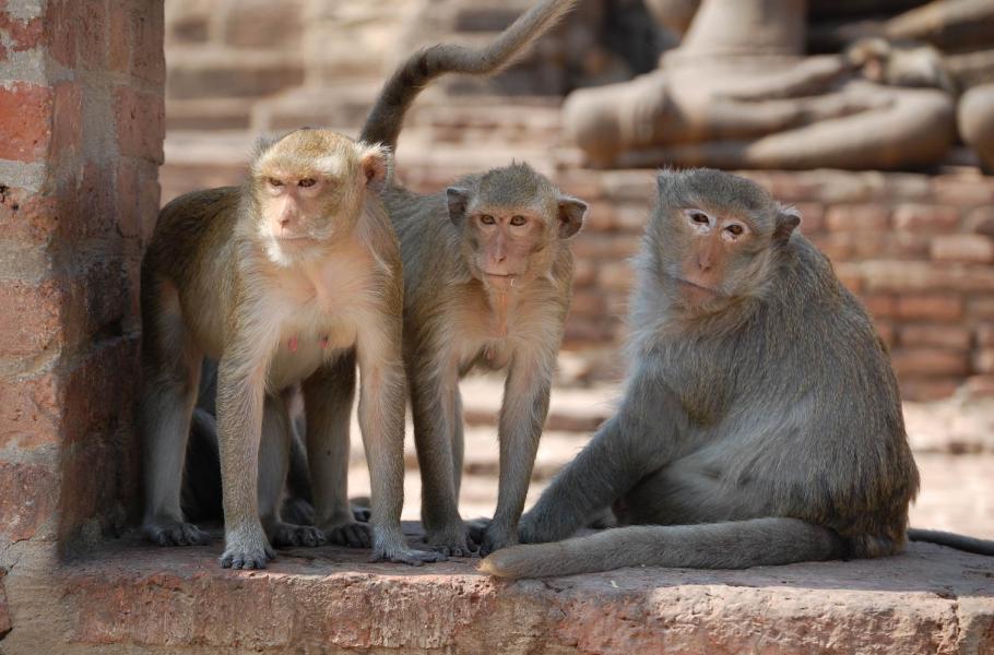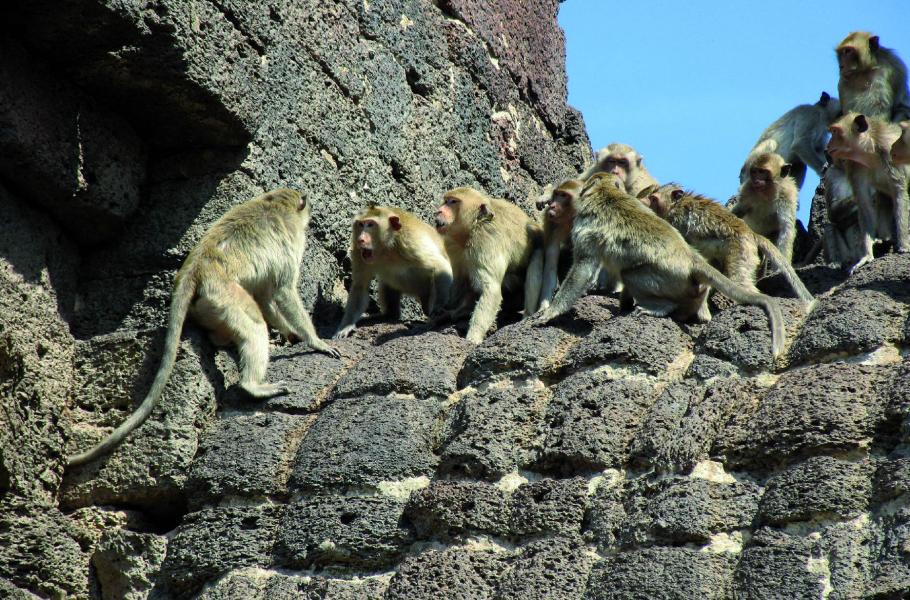 Lopburi, ležící zhruba 150 kilometrů severovýchodně od Bangkoku, má zvláštní populační složení: spolu s 27 tisíci lidí tu žije dva tisíce makaků. Opice ve městě zabydlely lampy veřejného osvětlení, římsy domů, televizní antény na nich, o kus dál střechu nádraží a občas, na malou chvilku, než se lidský majitel vzpamatuje, i nějaký ten voňavý stánek v městské tržnici. Ale především si oblíbili dva chrámové komplexy Sarn Phra Karn a Prang Sam Yot, kde se k jídlu dostanou úplně bezpracně – lidé jim ho tam sami nosí až pod nos.