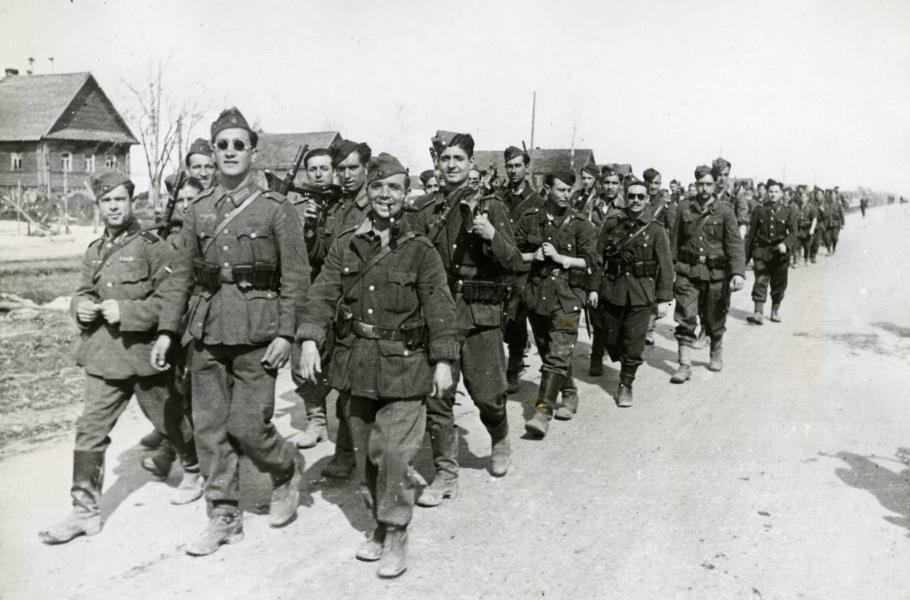 Během druhé světové války zůstalo Španělsko neutrální. Fašistický diktátor Francisco Franco však povolil nábor dobrovolníků do divize, která nakonec strávila rok a půl na volchovské a leningradské frontě