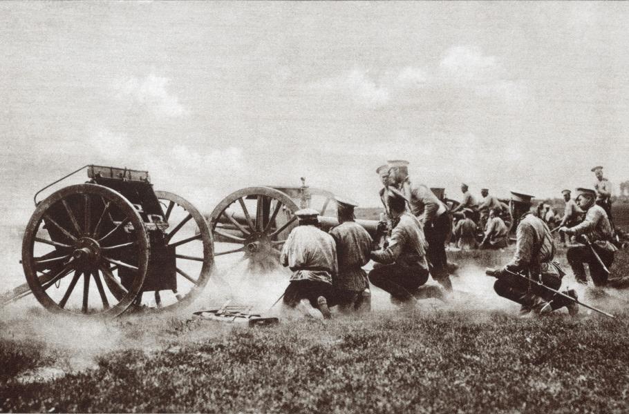 Lehké polní kanony měly podporovat pěchotu v manévrovém boji. Na snímku ruští dělostřelci v akci na východní frontě.