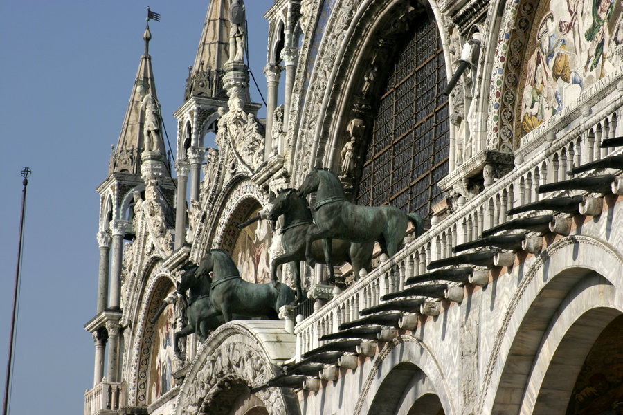 Z kořisti křižáků pocházejí například čtyři měděné pozlacené sochy koní vytvořené na přelomu letopočtu. Každý kůň je odlit ze dvou kusů, jejichž spojení se nachází pod pásem na krku. Čtyřspřeží stálo původně na konstantinopolském hipodromu. Poté po staletí zdobilo vchod do baziliky svatého Marka jako symbol svobody a nezávislosti Benátek. Dnes jsou zde umístěny jejich bronzové kopie, originály najdete v muzeu.