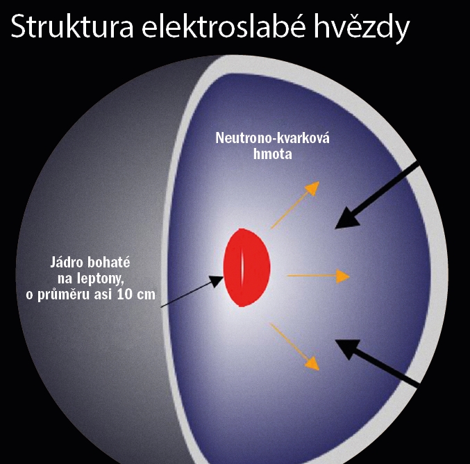Model vnitřní struktury elektroslabé hvězdy. Její vnější vrstvy tvoří zřejmě podobný materiál jako hvězdy neutronové. Stálice má průměr zhruba 5 km. V jejím centru se nachází jádro o rozměru jablka, tvořené směsí kvarků měnících se na leptony. Takto malé jádro by však dosahovalo asi dvou hmotností Země.