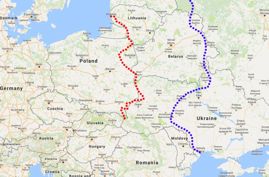 Stalinova linie (1941) a Molotovova linie v letech 1939 – 1941 (červeně). (zdroj: Wikimedia Commons, CC0)