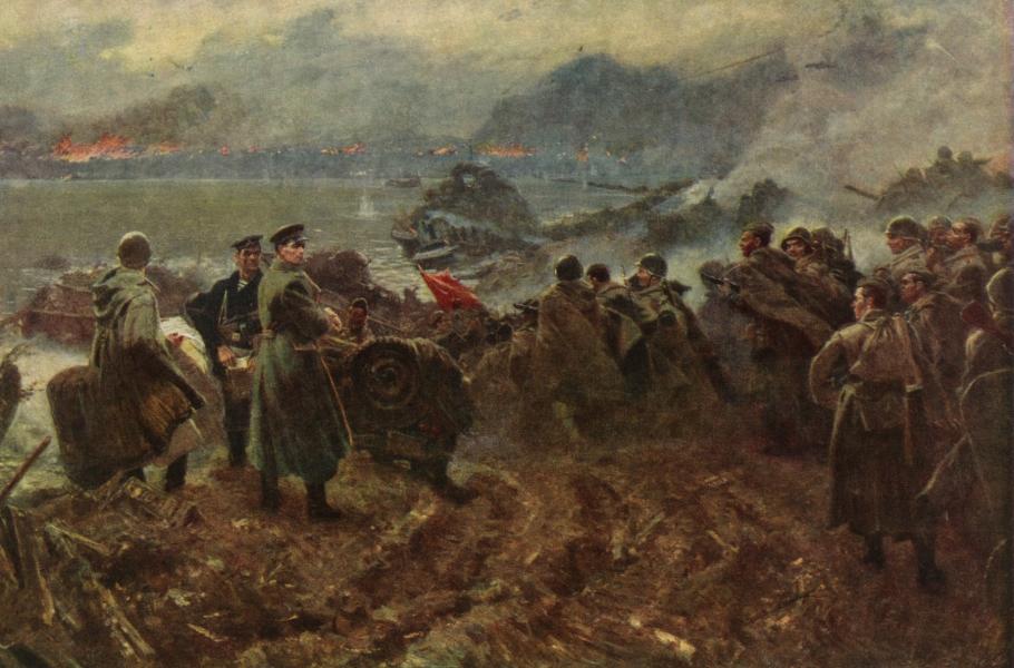 Žukov si vydobyl pověst zachránce Stalingradu, sovětští vojáci na obraze se přepravují přes Volhu do města.