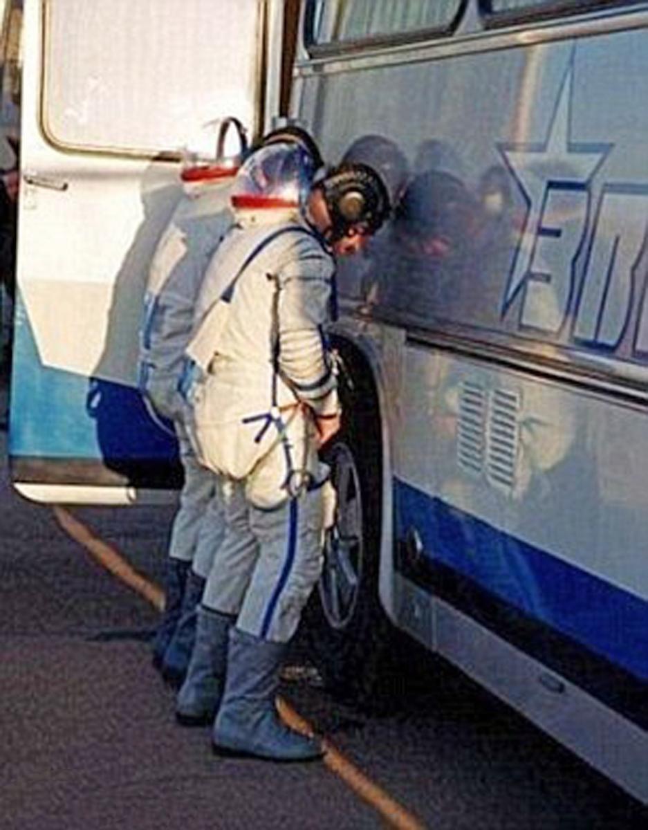 Než tam však dojedeme, čeká nás další neopominutelný zvyk. V půli cesty autobus zastavuje, celá posádka vystupuje a společně si ulevujeme na levé zadní kolo. Jako mnoho již zmíněných tradic, i tuto má na svědomí Gagarin, který si takto údajně odskočil během své cesty k raketě. Z pochopitelných důvodů se zvyku neúčastní ženy, ačkoliv se ví, že minimálně jedna z nich – Claudie Haigneréová – se do něj nepřímo zapojila pomocí lahvičky…
