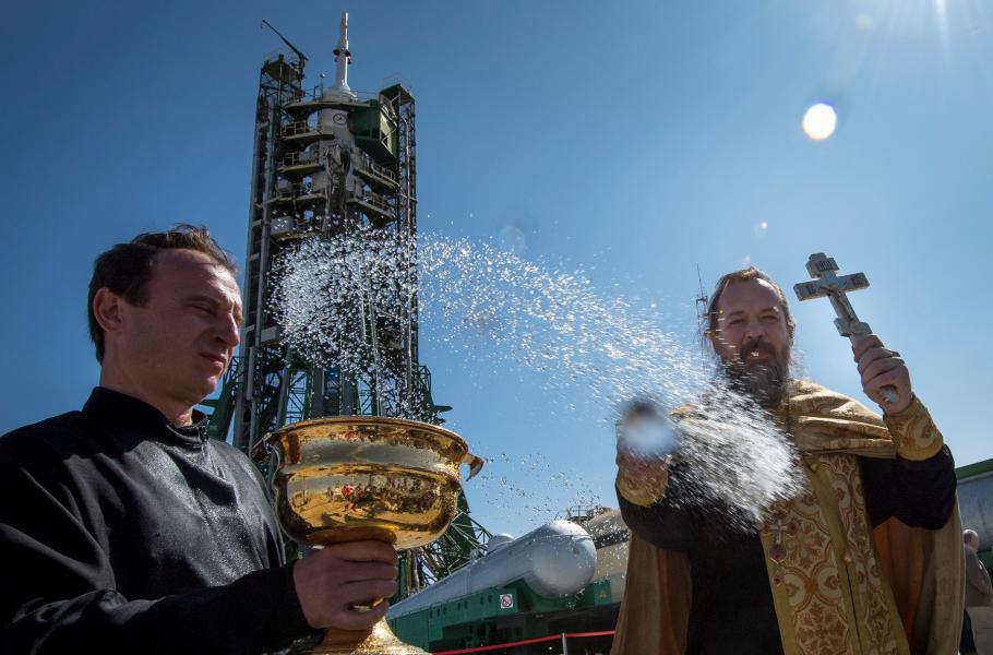K tradicím dodržovaným na Bajkonuru patří požehnání raketě i posádce od pravoslavného kněze.