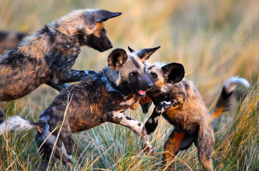 Při jeho slovech si vybavuji jedno ráno, kdy jsem fotografoval velkou smečku psů, kteří využívali sílícího slunce ke hrátkám na asfaltové cestě. Kompozice divokých zvířat na asfaltu se mi příliš nezamlouvala, ale v případě těchto běžců savan si člověk nemůže vybírat. Smečka měla víc než deset štěňat ve věku maximálně půl roku. Dorostenci byli velmi živí, nevybíravým způsobem napadali jeden druhého nebo kousali do uší své tety.