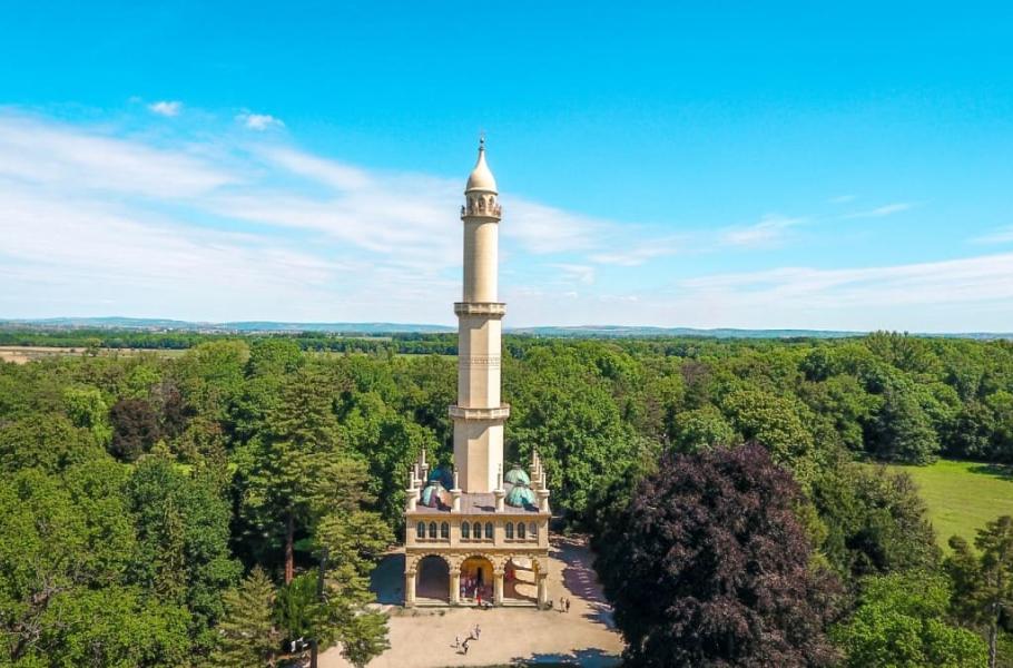 Exoticky vyhlížející stavba zachycená na fotografi není ničím jiným než slavným minaretem, který vyrostl na počátku 19. století v lednicko-valtickém areálu.