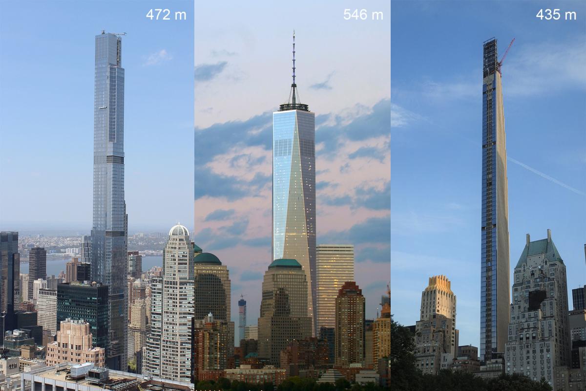 Zleva Central Park Tower (Wikimedia Commons, Percival Kestreltail, CC BY-SA 3.0), One World Trade Center (Wikimedia Commons, Phil Dolby, CC BY 2.0) a Steinway Tower (Wikimedia Commons, Jim.henderson, CC BY-SA 4.0)