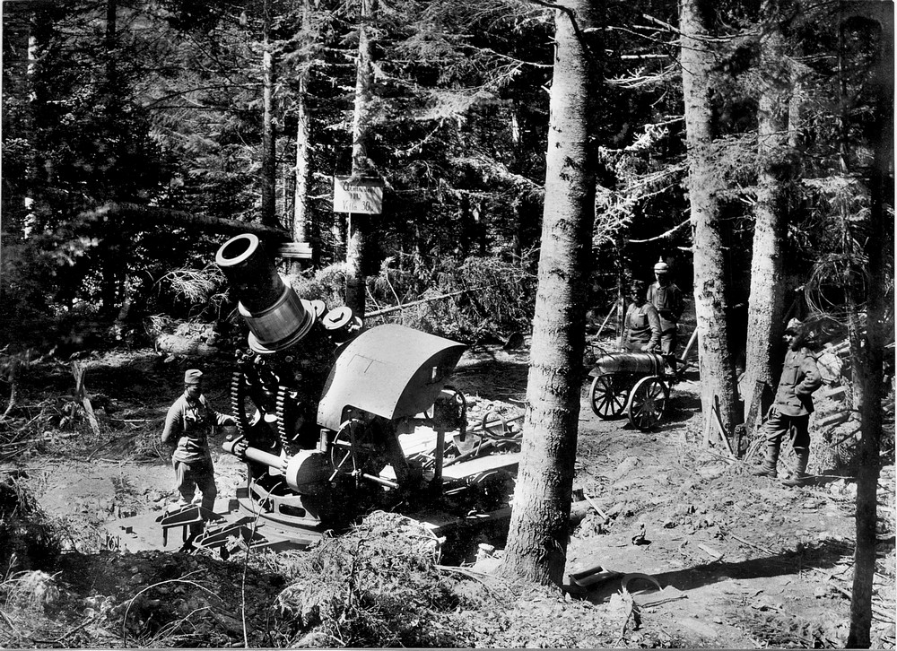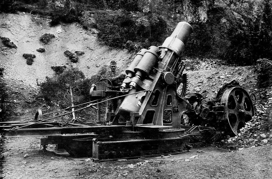Připraven k palbě. Postavení moždíře kdesi v Alpách, ze snímku je patrná robustní konstrukce i fakt, že obsluha musela vyhloubit lože pro lafetu. Před zbraní je vidět přední pár kol z lafetového přívěsu. (foto: Österreichische Nationalbibliothek, PDM 1.0)