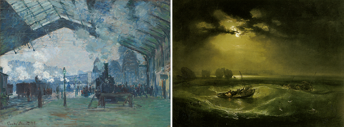 Vlevo obraz Příjezd vlaku na nádraží Saint-Lazare, Claude Monet, vpravo Rybáři na moři, J. M. W. Turner. (zdroj Wikimedia Commons 1 + 2, CC0)