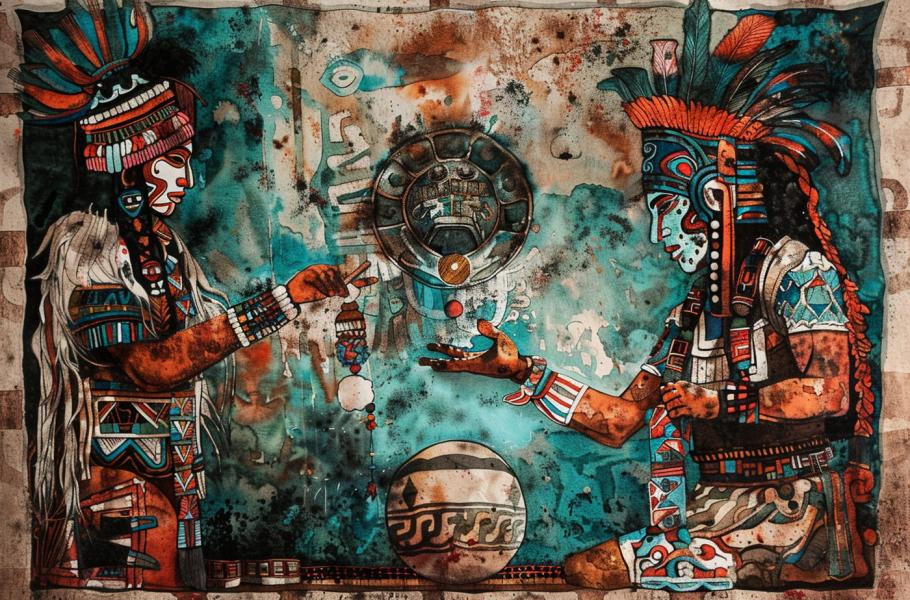 Tlachtli, Mayi nazývaná pok-a-tok, byla míčová hra, která byla jako rituál součástí náboženství v předkolumbovské době u řady mezoamerických kmenů. (ilustrace: Midjourney AI, PDM 1.0)