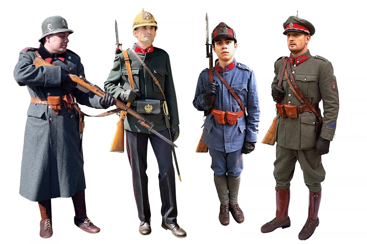 Četnické uniformy: (zleva) uniforma z konce 30. let, uniforma z let 1902 až 1918, prozatímní stejnokroj z konce roku 1918 a československá uniforma z 20. let.