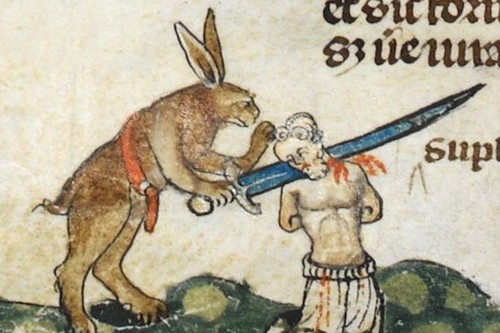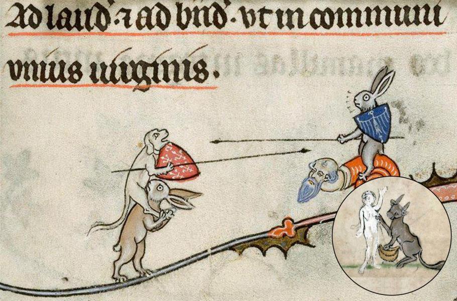Zvláštní roli tu přitom sehráli obyčejní zajíci a králíci. Ti totiž napříč středověkými bestiáři symbolizovali lidský strach a současně důvěru v Boha. Králík byl čistý, bezbranný a jeho jedinou obranou před lovci, nebo pokušením, byl útěk. V droleriích ale narážíme na trochu jiný model. Když máte trpělivost a lupu, uvidíte často zajíce, jak se sekyrou odvážně číhají na lovce, pronásledují s oštěpem celé lovecké smečky, dobíjejí rytíře palicí, nebo se na zádech hlemýžďů účastní rytířských turnajů. Ve vztahu k jinak jistě moralizujícímu náboženskému textu nám tak iluminátor předává poselství, že se nemáme vždy zbaběle skrývat a podřizovat božským autoritám, prchat před rizikem a pokušením, ale máme sami přijmout odpovědnost za svůj osud a bojovat s útrapami. Což je dost odvážný pohled na věc, který mohl iluminátorovi vynést hezkých pár postních týdnů, pokud si takových malůvek všiml jeho představený.