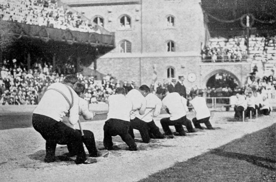 Týmy přitom mohly sestávat i z více národností, a první zlaté medaile tak v roce 1900 společně vybojovali tři Švédové a tři Dánové. V následujícím ročníku disciplínu naprosto ovládly Spojené státy, jejichž závodníci se umístili na prvních čtyřech příčkách, zatímco roku 1908 putovaly všechny cenné kovy do Británie. Uvedený ročník přitom narušila mizerně definovaná pravidla: Účastnit se mohli také „amatéři“, které spojovalo zaměstnání. Například liverpoolští policisté se proto postavili na start v těžké taktické obuvi, čímž získali nefér výhodu – a ospravedlnili ji tvrzením, že jde o standardní výbavu. Rozhodčí jim sice výmluvu uznali, ale ani tak nedokázali liverpoolští muži zákona porazit své protějšky z Londýna… (foto: Wikimedia Commons, PDM 1.0)