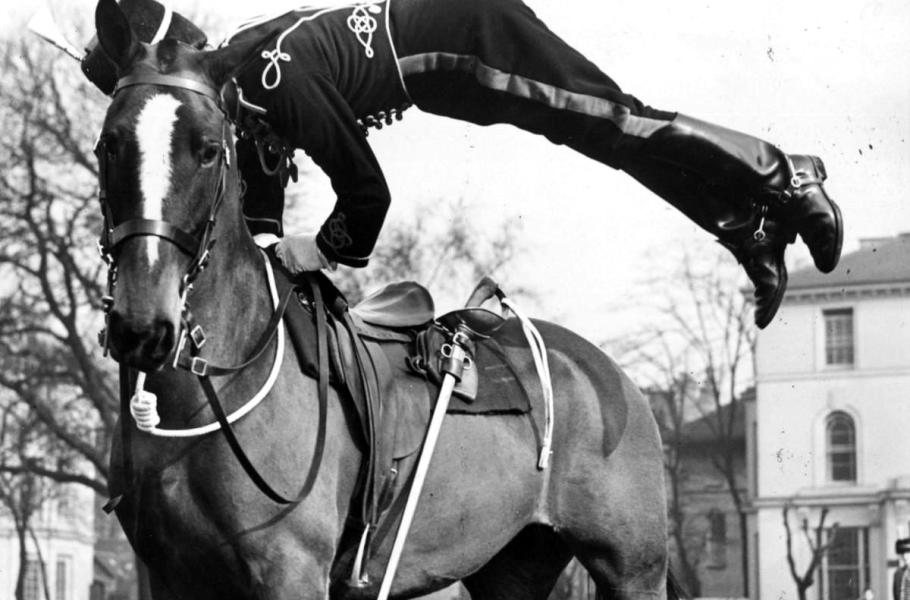 Voltiž se někdy označuje jako tanec na koni, v roce 1920 se však jednalo spíš o gymnastiku s ořem. Soutěžící měli za úkol naskočit do sedla z obou stran, poté zvíře zcela přeskočit a následně zařadit salto. Poslední disciplína spočívala v předvádění gymnastických kousků, zatímco kůň pomalu kráčel. Soutěž ovládlo Dánsko, které získalo zlato a bronz, zatímco stříbro putovalo do Francie. (foto: Getty Images)