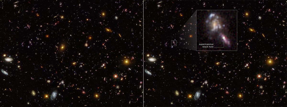 Černé díry hrají důležitou roli v životním cyklu všech galaxií, jejich evoluci ale stále obestírá řada tajemství a záhad. Aby vědci získali přesnější obraz toho, jakým způsobem se tato gravitační monstra promítají do evoluce galaxií, mapovali pomocí Hubbleova dalekohledu populace slabých galaxií v době, kdy byl vesmír starý jen několik procent svého současného stáří. Opakovaná pozorování po několika letech ukázala změny v jasnostech těchto galaxií, což podle vědců naznačuje přítomnost černých děr.
