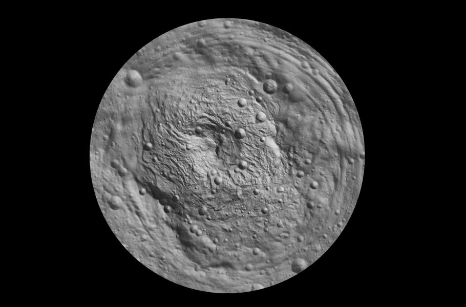 Kráter Rheasilvia částečně překrývá další obří impaktní struktura, Veneneia, o průměru kolem 395 km. První zmíněný útvar objevil Hubbleův teleskop již v roce 1997, jména se však dočkal až v roce 2011, kdy sonda Dawn pořídila detailní záběry povrchu Vesty. Stáří uvedených kráterů neznáme, ale podle některých odhadů může činit zhruba 2–3 miliardy let. (foto: NASA, CC0)