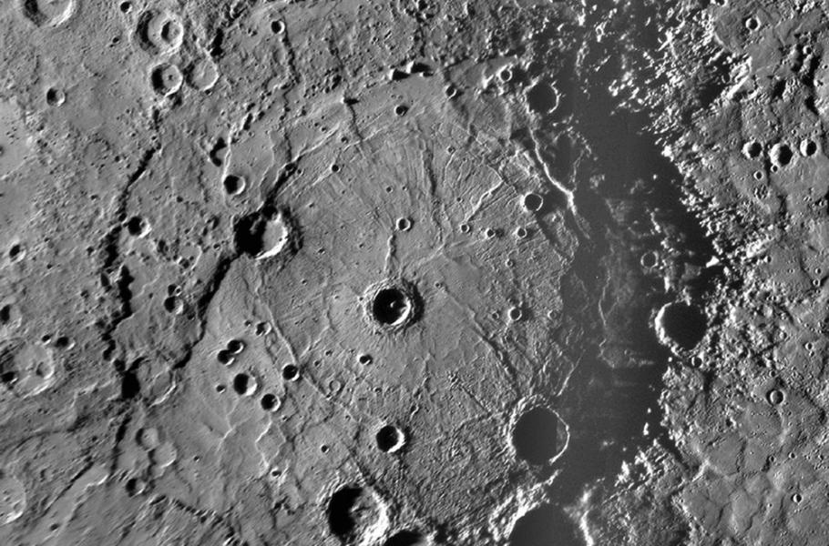 Mare Imbrium je druhým největším měsíčním mořem a zároveň nejrozměrnější lunární kotlinou. Můžeme jej pozorovat přímo, neboť se nachází na přivrácené straně našeho souputníka. Jde tak bezpochyby o největší dopadový kráter, jejž spatříme na vlastní oči a bez dalekohledu. Po oblasti Jižní pól – Aitken se jedná o nejrozsáhlejší impaktní strukturu na Měsíci, přičemž vznikla rovněž před necelými čtyřmi miliardami let obří srážkou. Stáří Moře dešťů známe dokonce výrazně přesněji, díky exaktnější metodě radiometrického datování uran–olovo uplatněné na vzorcích z lunárního povrchu: Konkrétně jde o 3,938 miliardy let, s možnou chybou čtyř milionů roků. Průměr tělesa, které se s naším průvodcem srazilo, odhadují vědci na 250 km. (foto: NASA, CC0)