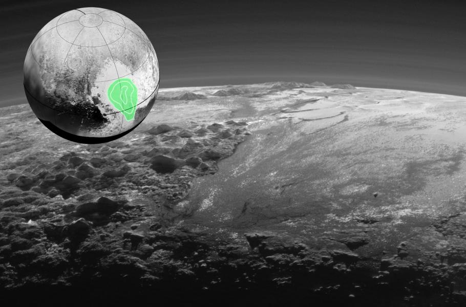 Planinu Sputnik se podařilo objevit teprve v roce 2015, díky snímkům sondy New Horizons. Útvar leží na severní polokouli trpasličí planety, zabíhá však i mírně pod rovník. Nese jméno první umělé družice Země, kterou se v roce 1957 stal legendární Sputnik 1. Planina má rozměry zhruba 1 050 × 800 km, její maximální šířka však dosahuje téměř 1 500 km (podle jiných údajů „jen“ 1 300 km). Je téměř jisté, že vznikla před dávnou dobou srážkou Pluta a objektu o průměru asi 150–300 km. Pohoří na jejích okrajích se tyčí do výšky několika kilometrů – jedná se například o Hillary Montes a Norgay Montes, nesoucí jména prvních pokořitelů Everestu. Protože se na zmíněné části Pluta nenacházejí žádné menší viditelné krátery, nepřesahuje zřejmě stáří tamního povrchu 10 milionů let. (foto: NASA, CC0)