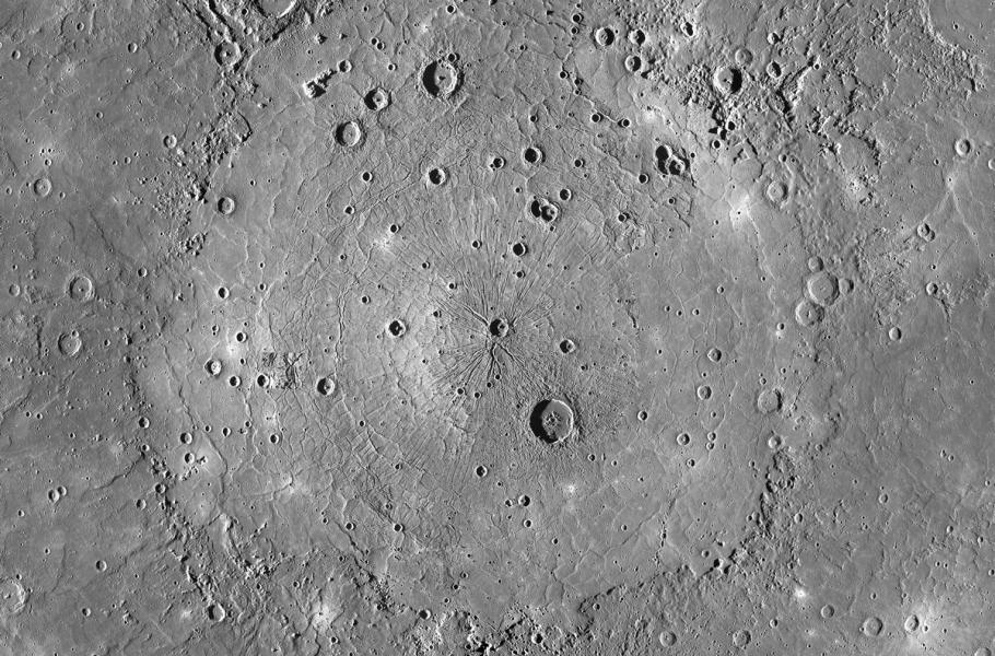 Kráter objevila sonda Mariner 10 v roce 1974 a vědci zpočátku jeho průměr odhadovali na 1 300 km. Pojmenování Caloris Planitia, tedy doslova „pánev tepla“, získal od astronauta a člena týmu mise Mariner 10 Briana O’Learyho. Srážka, jež stála u zrodu kráteru, mohla ovlivnit podobu povrchu celé planety. (foto: NASA, CC0)