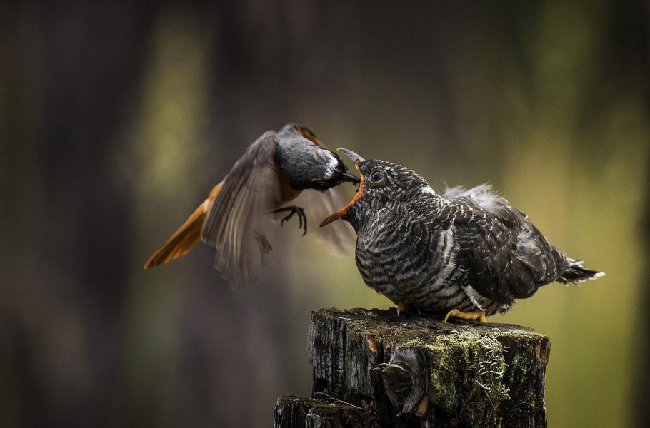 Kukačka obecná proslula svým hnízdním parazitismem. Ivan Hurbánek ji zachytil v okamžiku, kdy se ji pokoušel krmit zhruba o polovinu menší rehek zahradní.
