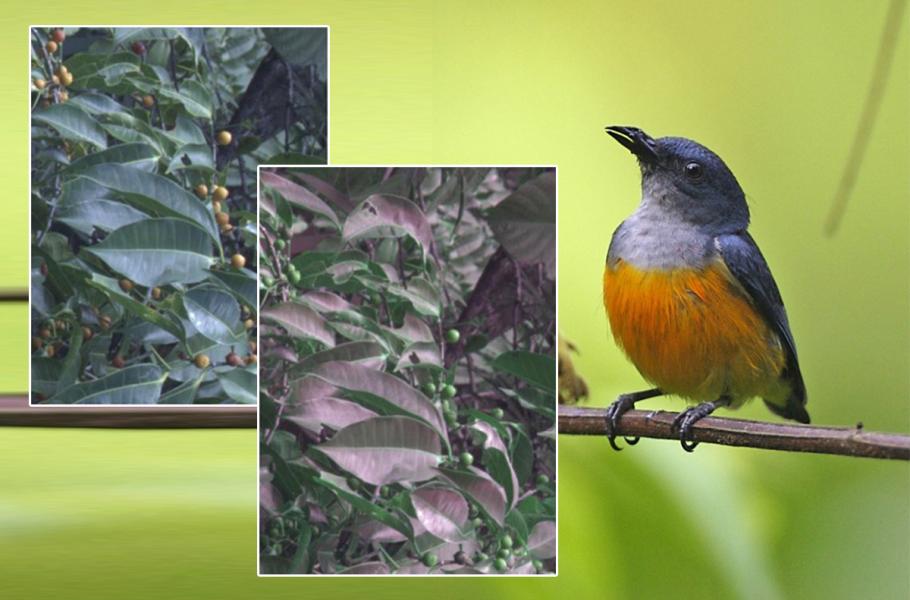 Ptáci, včetně tohoto květozoba oranžovobřichého (Dicaeum trigonostigma), vidí barvy jinak. Záběr pořízený speciální kamerou dole napodobuje způsob ptačího vidění, nahoře je běžný pohled lidským okem.
