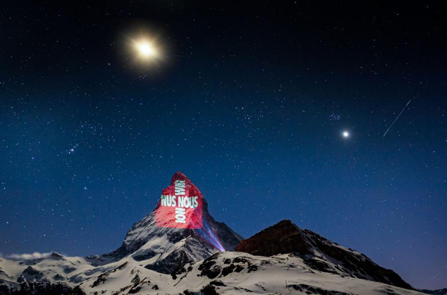 Ze švýcarského alpského střediska Zermattu se každý den po setmění zaměří světla na štít Matterhornu a vytvoří na něm obraz podle návrhu Švýcara Gerryho Hofstettera. Zermatt, uvyklý na ruch a turisty, nyní zeje kvůli koronaviru prázdnotou. Iluminační akcí chce prokázat solidaritu s celým světem, který čelí smrtící epidemii.