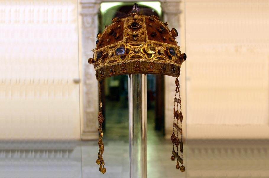 Koruna sicilské královny a císařovny Svaté říše římské Konstancie Aragonské je vlastně čapka ozdobená zlatem a drahokamy a pro tu dobu typickými postranními přívěsky (začátek 13. století). (foto: Wikimedia Commons, José Luiz Bernardes Ribeiro, CC BY-SA 4.0)