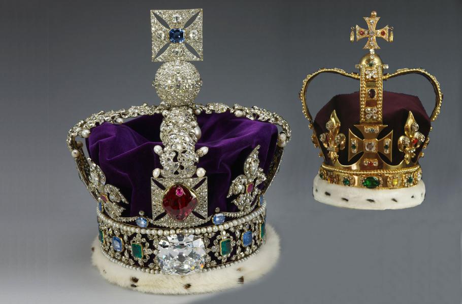 Je pravá a přesto není! Koruna svatého Eduarda (vpravo), jíž jsou korunováni angličtí králové, je replika z roku 1660. Originál totiž nechal o pár let dříve roztavit tehdejší správce Anglie, lord protektor Oliver Cromwell. Když byla obnovena monarchie a Karel II., syn popraveného Karla I. Stuarta, se vrátil z exilu, nechal si korunu vyrobit znovu – byť v poněkud baroknější a také levnější verzi. Teprve ve 20. století totiž byly některé polodrahokamy nahrazeny skutečnými drahokamy.