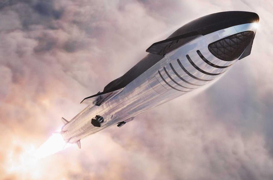 Doslova monstrózní, kompletně znovupoužitelný dopravní systém vyvíjí firma SpaceX vizionáře Elona Muska. První stupeň Super Heavy o průměru 9 m bude měřit na výšku 70 m a jeho nosnost na nízkou oběžnou dráhu přesáhne 100 tun. Raketa má využívat 28 motorů Raptor na kapalný metan a kyslík. Druhý stupeň tvoří loď Starship, pro přepravu nákladu a posádky. (foto: Wikimedia Commons, Musker Busker, CC BY-SA 4.0)