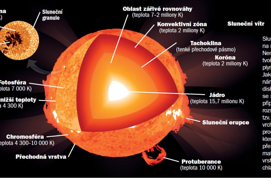 Sluneční těleso plynule přechází v atmosféru, jež má tři vrstvy: spodní tenkou fotosféru, odkud Slunce opouští drtivá většina záření; chromosféru, kterou můžeme sledovat speciálními dalekohledy; a „střapatou“ korónu, dobře známou z úplných zatmění.