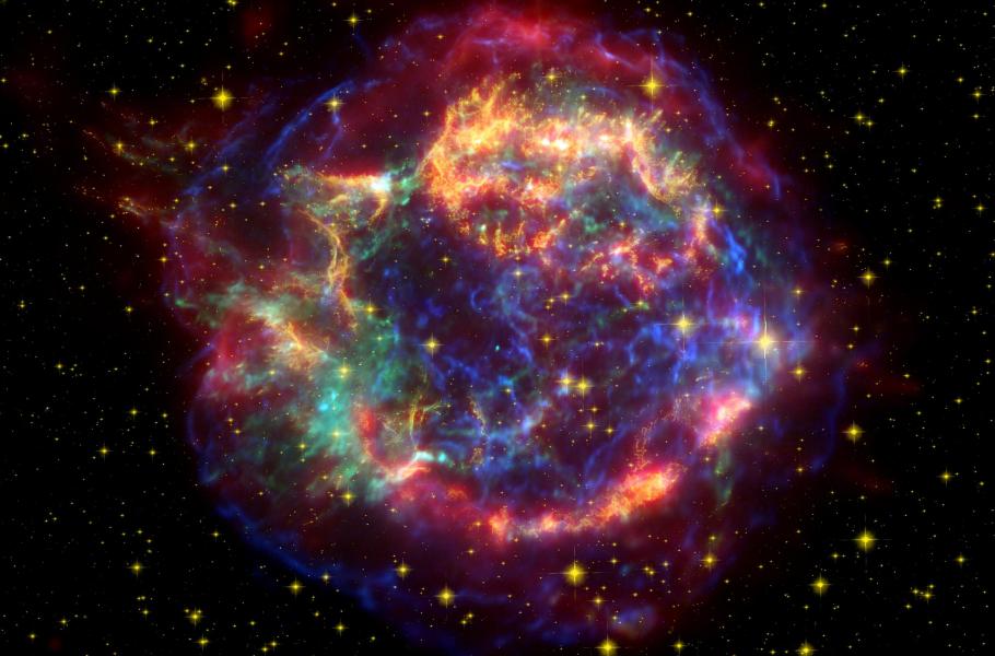 Zbytek po supernově s označením Cas A. Mezi putujícími rázovými vlnami na okraji zbytku dochází k urychlování nabitých částic na vysoké energie