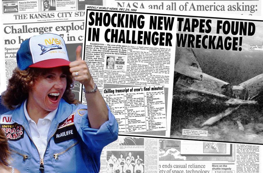 Takto informoval o tajuplné nahrávce týdeník Weekly World News v roce 1996 (včetně sugestivní fotografie rozlomeného raketoplánu)… Vlevo nadšená Christa McAuliffeová poté, co se dozvěděla, že právě ona bude „učitelem ve vesmíru“.