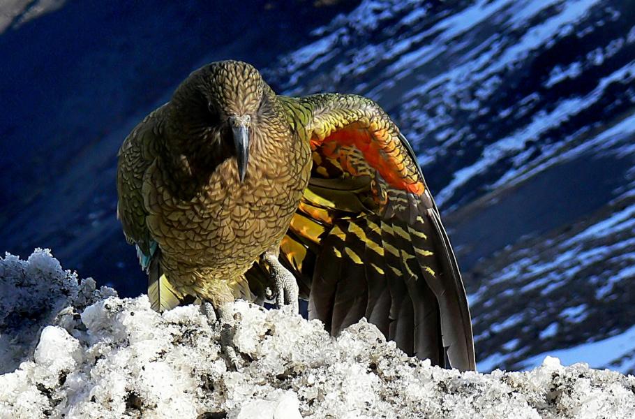 Papoušek nestor kea (Nestor notabilis) má v klidu zeleno-hnědou barvu, ovšem pokud roztáhne křídla, promění se v pestrobarevný skvost. (foto: Wikimedia Commons, Bernard Spragg, CC0 1.0)